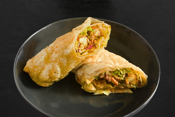 This paratha roll features succulent boneless beef marinated in traditional spices. Drizzled with tangy tamarind, mint raita and spicy hot sauce, complemented by crisp iceberg lettuce and fresh onions🌯🍢